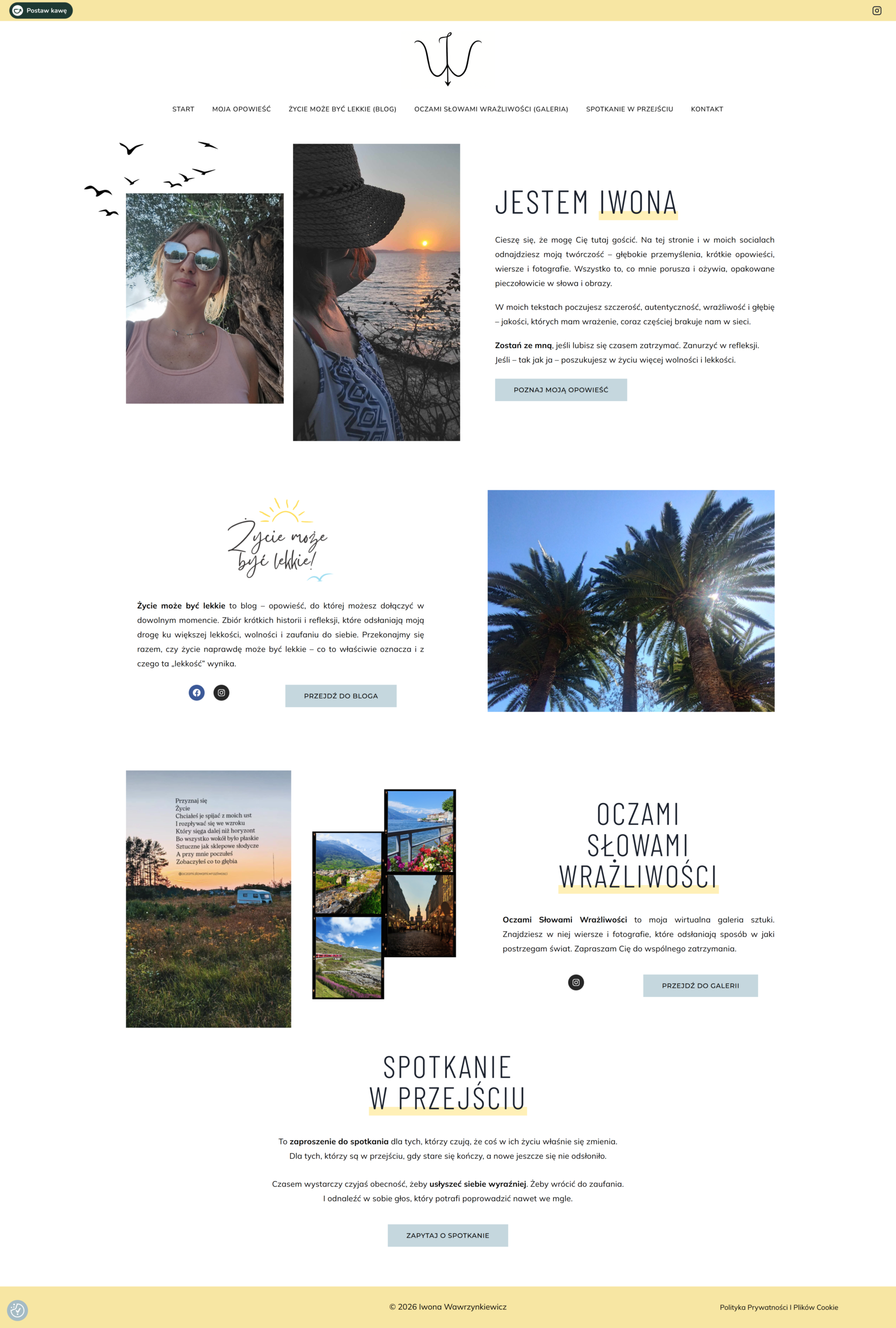 Moją rolą okazało się inicjowanie procesu odkrywania swojej roli w świecie i towarzyszenie w tym przejściu – od jej narodzin po wyjście z nią do świata. Sama przeszłam podobną drogę, a jej owocem jest moja nowa oferta oraz strona iwonawawrzynkiewicz.pl. Proces przejścia od pierwszej wizji, przez klarowanie roli i nadawanie jej formy, aż po jej urzeczywistnienie w świecie zawiera oferta „Twoja droga ku wolności”. Niezmiennie dla osób, które pragną pokazać się w świecie online, dostępna jest również oferta tworzenia stron internetowych.